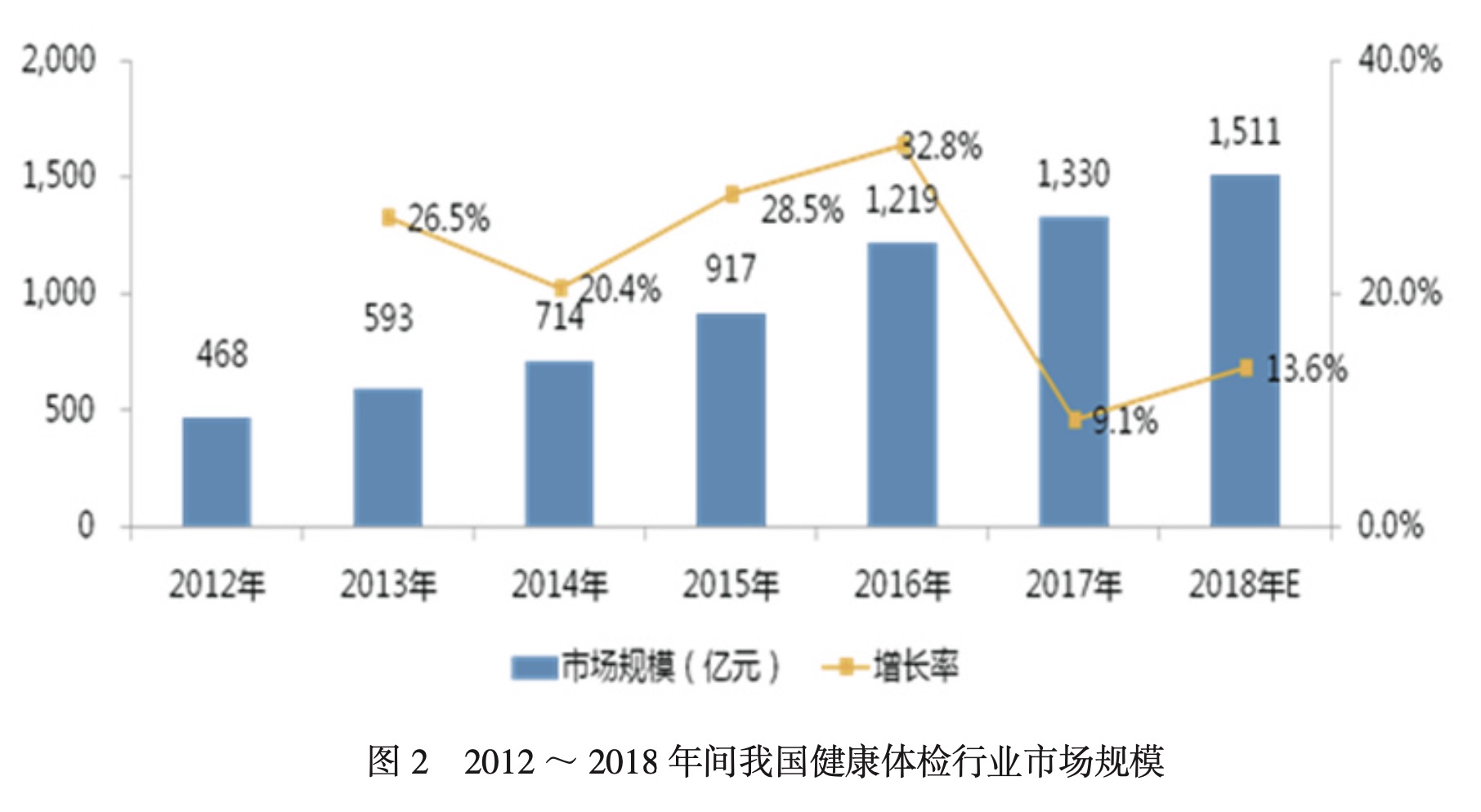 2012~2017年間,我國(guó)體檢市場(chǎng)規(guī)模的復(fù)合增長(zhǎng)率超過了23.2%,在2018年我國(guó)體檢市場(chǎng)規(guī)模已經(jīng)高達(dá)1511億,詳見圖2。
