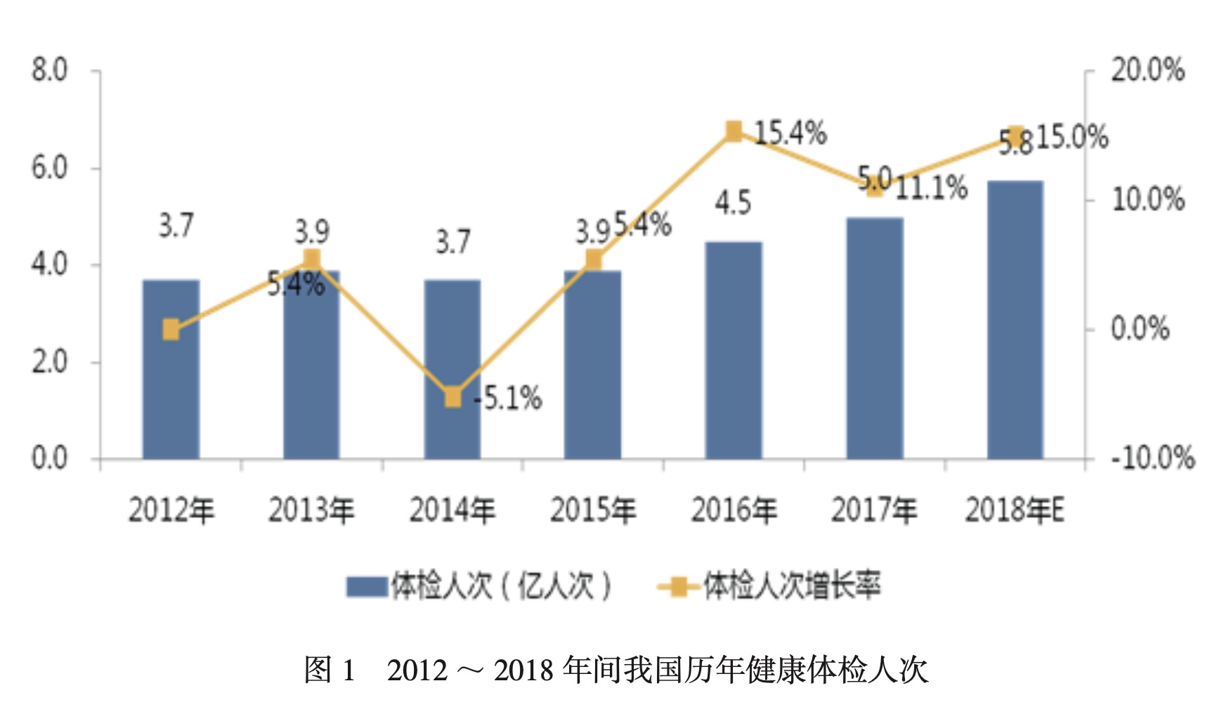 從全國(guó)市場(chǎng)來看,近年來我國(guó)健康體檢行業(yè)的發(fā)展呈快速增長(zhǎng)態(tài)勢(shì)。根據(jù)國(guó)家衛(wèi)生健康委員會(huì)相關(guān)統(tǒng)計(jì)數(shù)據(jù)及艾媒咨詢發(fā)布的《2018-2019中國(guó)體檢行業(yè)研究與商業(yè)投資決策分析報(bào)告》,2012~2017年間,我國(guó)體檢人次的復(fù)合增長(zhǎng)率約為6.2%,在2018年我國(guó)體檢人次已經(jīng)達(dá)到了5.8億,詳見圖1。