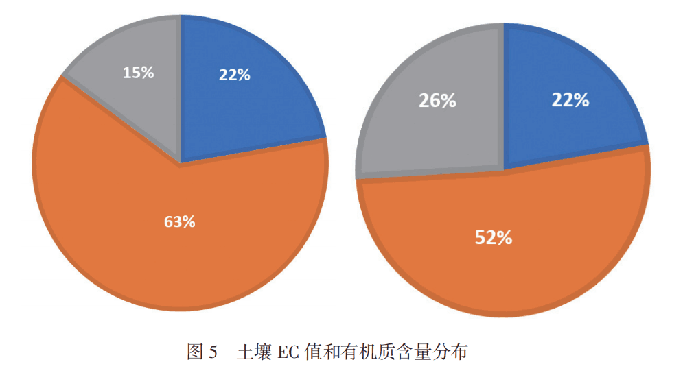 2.適宜苗木生長的EC值在0.15~0.9mS·cm-1之間,EC值過高則土壤含鹽量較高,EC值過低則土壤可溶性養(yǎng)分含量較低,項目區(qū)EC值滿足苗木種植要求的僅占22%。