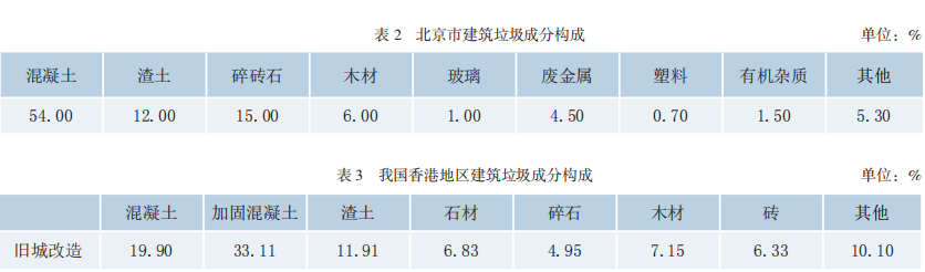 建筑物拆除過程中,根據(jù)不同結(jié)構(gòu)類型建筑物所產(chǎn)生的建筑垃圾各種成分的含量會有所不同,基本成分主要由渣土、灰塵、磚塊、混凝土、瀝青、玻璃、竹木、塑料、金屬、有機(jī)雜質(zhì)以及其他雜物等組成。根據(jù)對北京、香港等城市的建筑垃圾進(jìn)行調(diào)查(見表2、表3),各城市由于地域和建筑等特點,建筑垃圾組分構(gòu)成也不盡相同。