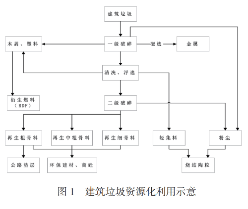 有別于生活垃圾中存在許多有毒有害物質(zhì),建筑垃圾大部分都屬于潔凈廢棄物,且利用率高,只要能夠被合理分類幾乎都可以通過加工后再利用,充分發(fā)揮其價值。建筑垃圾處理的根本,是根據(jù)來料成分與后期產(chǎn)品方向不同,對其進(jìn)行有效的分揀。目前建筑垃圾處理工藝主要是以分揀、破碎為初級程序,分揀后具備資源化利用價值的木材、金屬、玻璃等進(jìn)入回收利用渠道;初步回收后,建筑垃圾中混凝土塊、磚瓦混合類進(jìn)入垃圾資源化利用設(shè)施進(jìn)一步資源化利用,制成骨料;破碎后的骨料、中級骨料、精細(xì)凈骨料等進(jìn)入深加工,制成磚、砌塊、商品混凝土、輕質(zhì)墻板等產(chǎn)品。建筑垃圾資源化利用示意如圖1所示[5]。