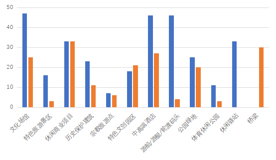 文旅資源豐富多元。從類型來看,文商旅資源占比高。兩岸中高端酒店和文化場(chǎng)館(含博物館、劇場(chǎng)、藝術(shù)館、展覽館、紀(jì)念館等)和資源最豐富,單類數(shù)量分別為73、72項(xiàng),兩類合計(jì)占比近三分之一。休閑商業(yè)項(xiàng)目次之,資源數(shù)量66項(xiàng)。從要素來看,食住行游購(gòu)?qiáng)省⑸甜B(yǎng)學(xué)閑情奇全覆蓋。兩岸文化和旅游資源多樣,商務(wù)、養(yǎng)生、研學(xué)、休閑、情感、探索等新產(chǎn)品新要素能夠滿足新時(shí)代游客的多元需求。