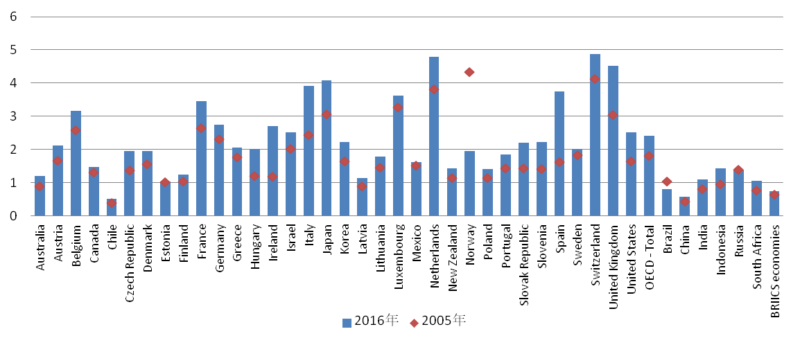 圖2 OECD國家與金磚國家的資源產(chǎn)出率(2005年與2016年對比)(USD/kg)