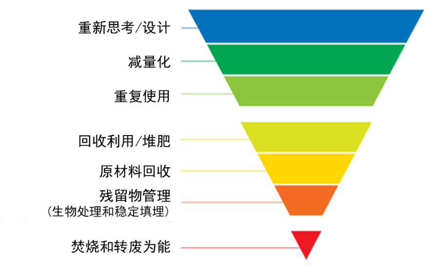 “無廢”的關(guān)鍵舉措即減量化(reducing)、再利用(reusing)、再循環(huán)(recycling)(3R原則)及無害化處置的焚燒(energy recovery)和填埋(disposal)。近年來,“無廢”的定義不斷演進,零廢棄國際聯(lián)盟(Zero Waste International Alliance)對“無廢”的最新定義為“通過負責(zé)任的生產(chǎn)、消費、重復(fù)使用以及產(chǎn)品、包裝和材料的回收來保護所有資源,不使用焚燒,且避免任何威脅環(huán)境或人類健康的排放”。相應(yīng)的,3R原則也得到了拓展,且體現(xiàn)出兩大新特點,一是更加重視源頭減量,最推薦的舉措是在產(chǎn)品設(shè)計環(huán)節(jié)就考慮減少廢棄物產(chǎn)生;二是為了減少溫室氣體排放,焚燒排在填埋之后成為最不推薦的兜底舉措(見圖3)。