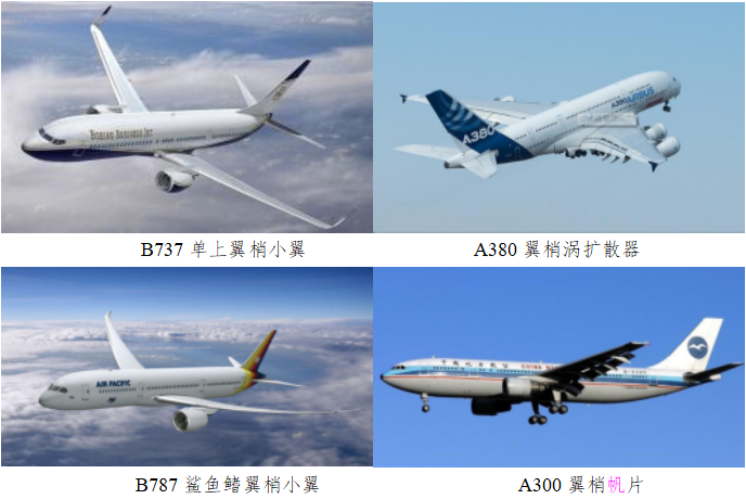 目前在民機(jī)上所用的翼梢小翼有:單上翼梢小翼、翼梢渦擴(kuò)散器、鯊魚鰭翼梢小翼、翼梢帆片等。