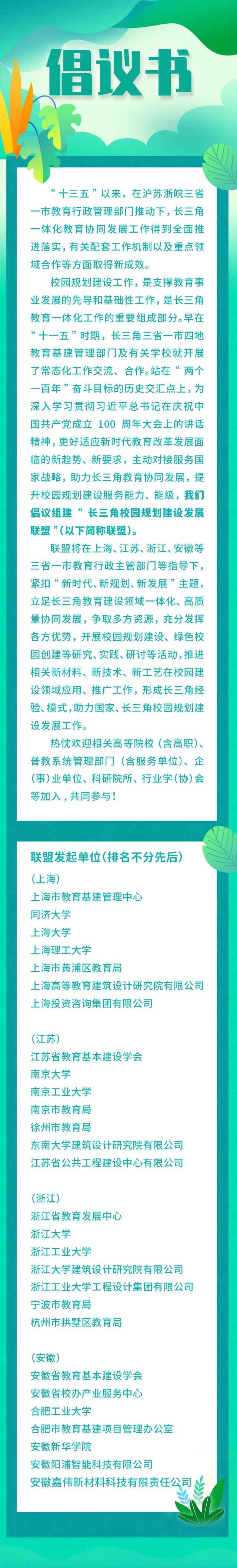 2021年10月,在上咨集團成立三十五周年之際,為進一步推動長三角教育協(xié)同發(fā)展,助力提升校園規(guī)劃建設(shè)服務(wù)能力,全面推進落實長三角教育一體化工作,包括集團在內(nèi)的滬蘇浙皖三省一市28家相關(guān)教育部門、企事業(yè)單位共同發(fā)出《倡議書》,倡議組建“長三角校園規(guī)劃建設(shè)發(fā)展聯(lián)盟”。