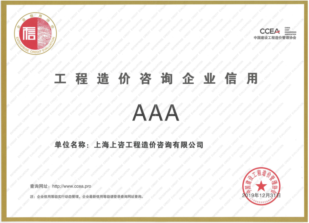 這是上咨造價(jià)繼獲評“中國建設(shè)工程造價(jià)管理協(xié)會工程造價(jià)咨詢企業(yè)信用AAA級”后的又一項(xiàng)國家級企業(yè)信用最高等級榮譽(yù)。企業(yè)信用最高等級的獲得,是行業(yè)對上咨造價(jià)專業(yè)能力和服務(wù)水平的充分肯定。