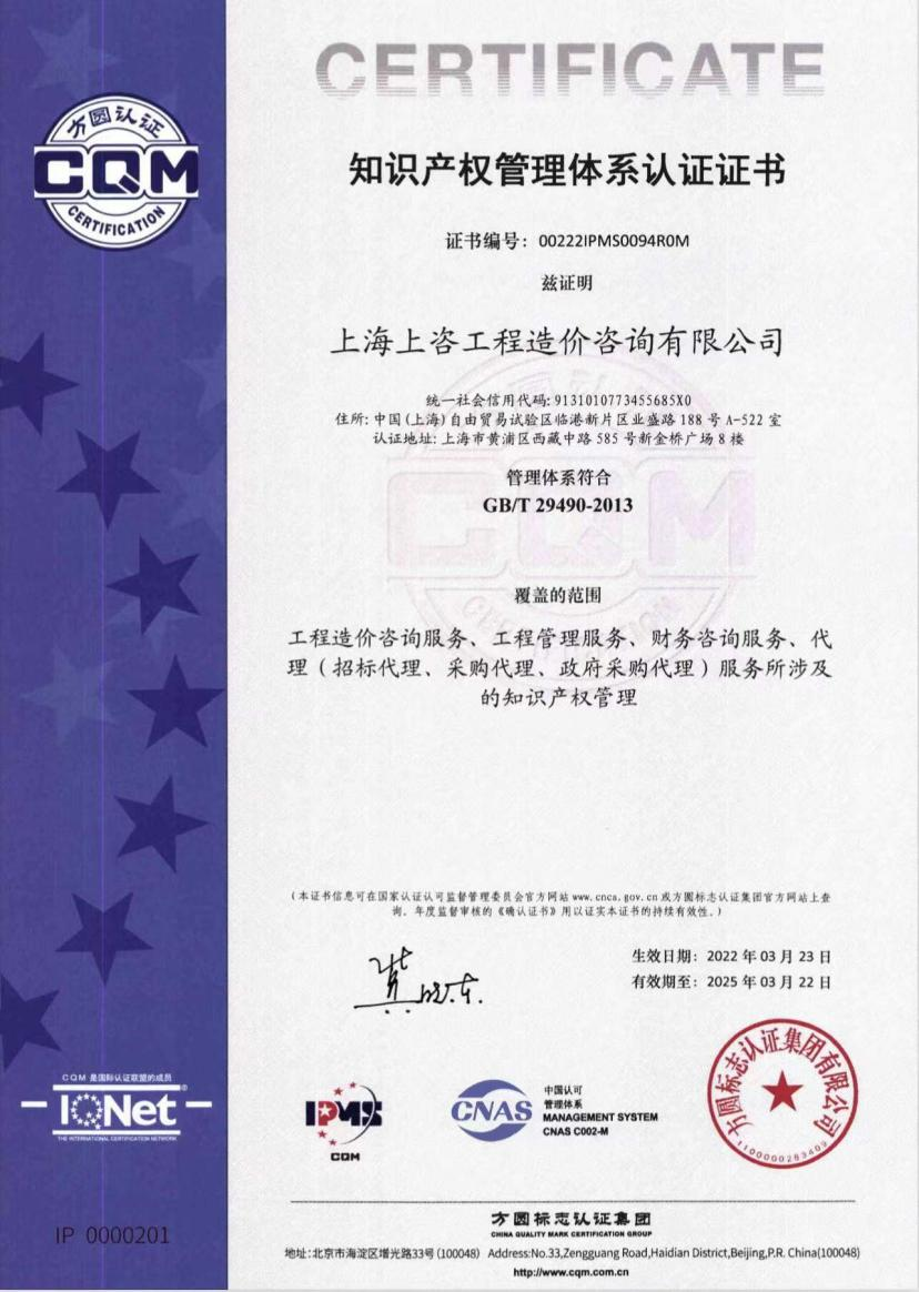 上咨造價榮獲知識產(chǎn)權(quán)管理體系認證證書