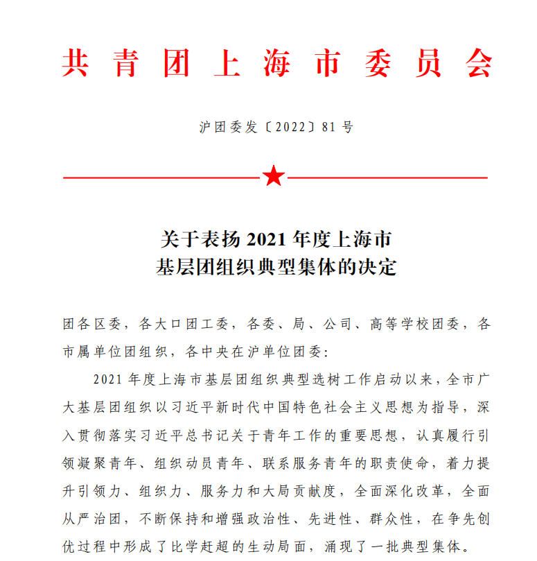 2022年是中國(guó)共青團(tuán)成立100周年。近日,共青團(tuán)上海市委員會(huì)作出表彰決定,授予156個(gè)團(tuán)(總)支部“上海市基層團(tuán)組織典型選樹”稱號(hào)。
