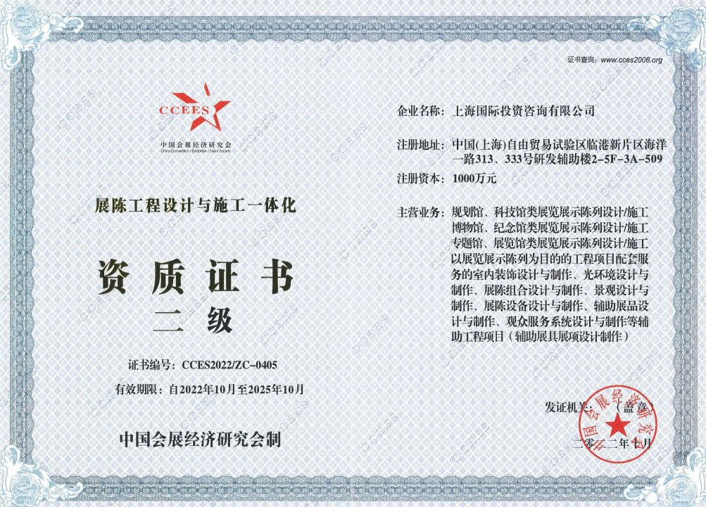 2022年11月,上咨國(guó)際成功取得中國(guó)會(huì)展經(jīng)濟(jì)研究會(huì)頒發(fā)的《展陳工程設(shè)計(jì)與施工一體化資質(zhì)(二級(jí))證書(shū)》,標(biāo)志著公司從展陳策劃咨詢到布展工程實(shí)施的全過(guò)程服務(wù)鏈構(gòu)建完成。