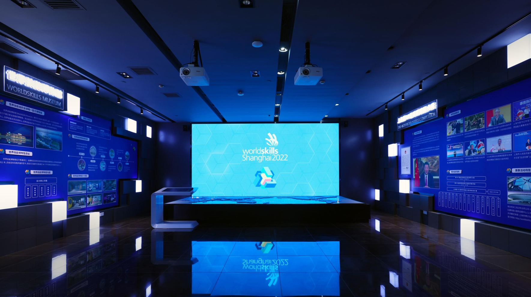 2022年3月,上咨為世賽執(zhí)行局提供了展廳的整體設(shè)計(jì)、施工、運(yùn)維保障等全過(guò)程服務(wù),設(shè)計(jì)將綠色可持續(xù)與科技感兩大元素與世賽主題相結(jié)合,打造出全新的多媒體展廳。展廳除了介紹上海第46屆世界技能大賽和世界技能博物館兩大板塊內(nèi)容,最值得一提的是采用了電動(dòng)玻璃屏和互動(dòng)沙盤(pán)的多方位體驗(yàn)多媒體互動(dòng)展示,通電玻璃幕墻打開(kāi)露出展廳全貌的那一剎那,驚艷全場(chǎng)。